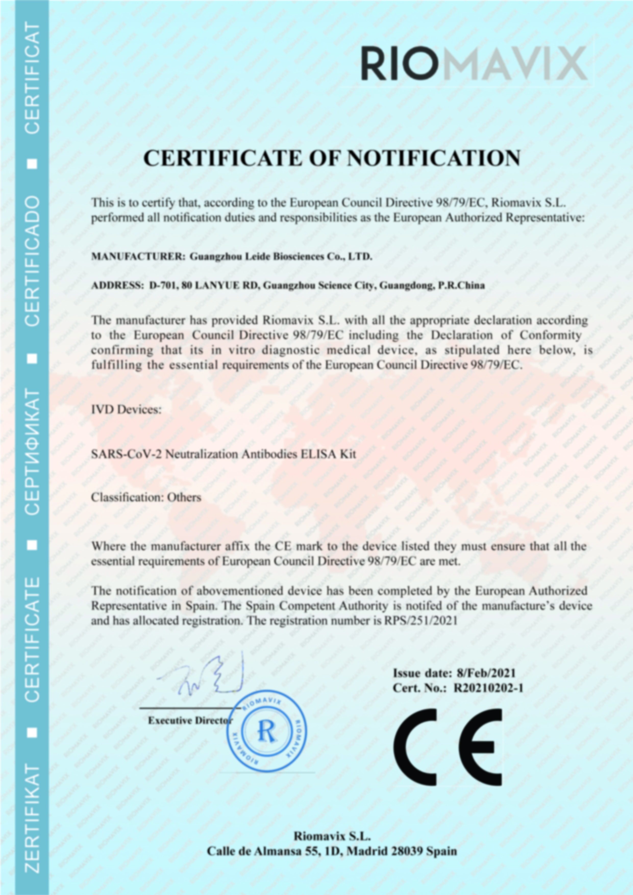 近日,由廣州市雷德生物科技有限公司(簡稱“雷德倍爾”)自主研發(fā)的新型冠狀病毒(2019-nCov)特異性細(xì)胞免疫反應(yīng)檢測試劑盒以及新型冠狀病毒(2019-nCov)中和抗體檢測試劑盒(ELISA),于2021年2月8日獲得CE認(rèn)證。
