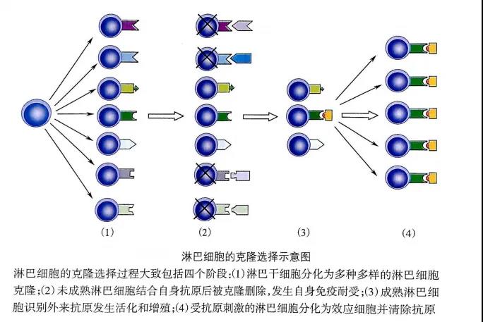 基于克隆選擇學(xué)說(shuō),機(jī)體自身的組織抗原成分在胚胎期就被相應(yīng)的細(xì)胞克隆所識(shí)別,相應(yīng)的未成熟淋巴細(xì)胞與機(jī)體自身抗原結(jié)合后被克隆刪除,發(fā)生自身特異性免疫耐受,即賦予機(jī)體免疫系統(tǒng)區(qū)分“自我”和“非己”的能力。值得一提的是,在胚胎期任何進(jìn)入機(jī)體的抗原都將被視作自身成分而產(chǎn)生免疫耐受。
