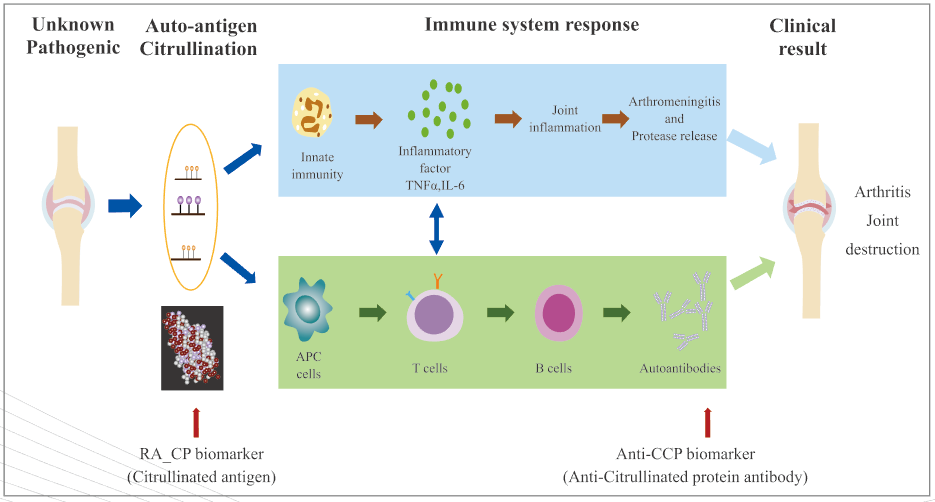 從2000年以來,除了國(guó)際公認(rèn)的RA診斷指南中CCP外,一直未有突破性的高靈敏指標(biāo)。我公司研發(fā)出最具潛力的RA血清學(xué)診斷新指標(biāo)——RA_CP(類風(fēng)濕關(guān)節(jié)炎瓜氨酸化蛋白檢測(cè)試劑盒),采用雙抗體夾心法測(cè)定人血清中瓜氨酸化類風(fēng)濕抗原,這是根據(jù)抗原-抗體的出現(xiàn)時(shí)間先后,疾病發(fā)生原理設(shè)計(jì)和臨床大量樣本驗(yàn)證了的一個(gè)檢測(cè)類風(fēng)濕關(guān)節(jié)炎疾病的新指標(biāo)。RA_CP對(duì)RA的檢測(cè)靈敏度85%-95%,特異性85%-95%,對(duì)于常規(guī)CCP檢測(cè)陰性的RA患者,RA_CP仍可檢出40%-50%(截至目前的數(shù)據(jù)是超過50%)。在CCP陰性患者中使用RA_CP可提高RA患者檢出率,提高臨床診斷類風(fēng)濕性關(guān)節(jié)炎的準(zhǔn)確性,顯著降低臨床漏診發(fā)生率,開展RA_CP檢測(cè)項(xiàng)目在臨床上可以更好地輔助RA診斷。
